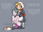 Cloud treats Morrigan very nicely. While Rin likes to abuse her as much as possible, Cloud addresses Morrigan as “lady” and serves her like she would Rin. Whenever Mila makes a plate of food for her “child” Cloud takes it after everyone leaves the dinner table and gives it to Morrigan. However, Morrigan sometimes lets the plate rot, not being used to eating a warm meal. She sees it as a breach of conduct if she takes one bite.