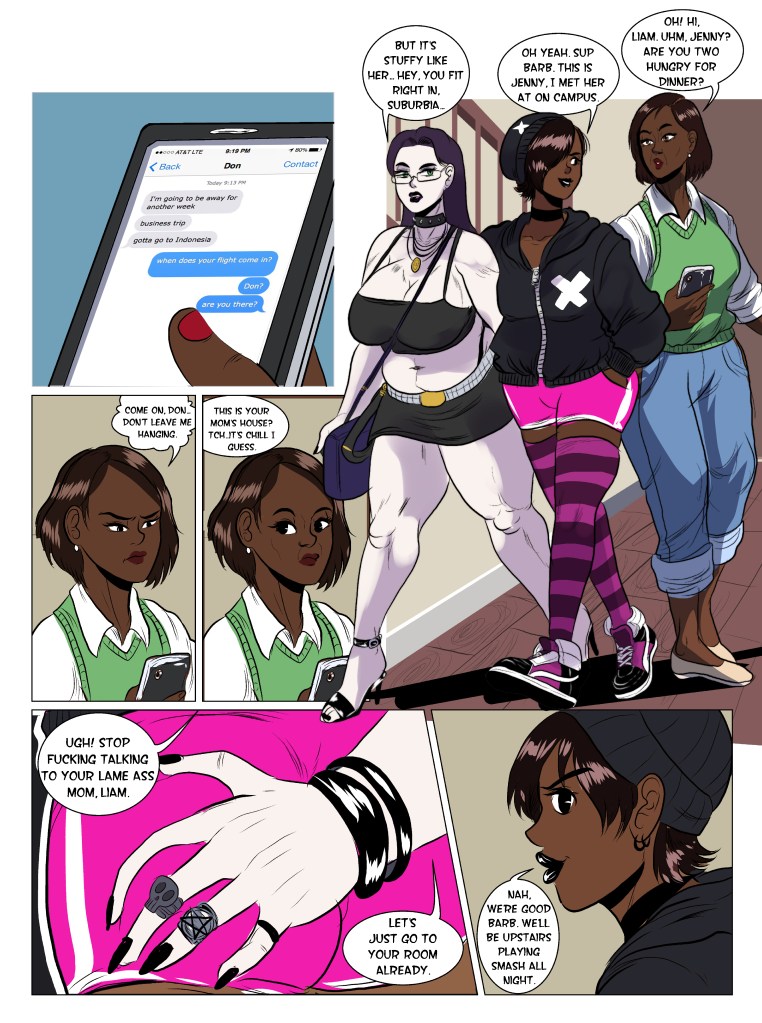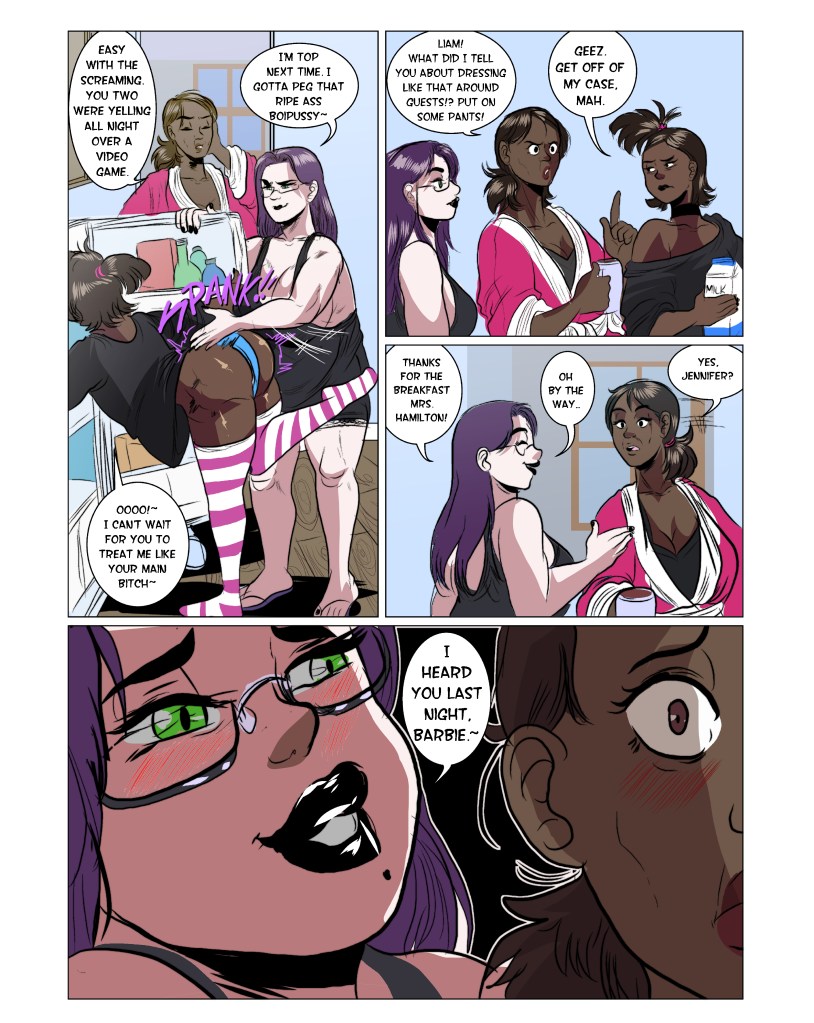 The first Vog Comix in the series to feature one of my recurring characters, Liam Hamilton. He’s been teasing his mother, Barbra Hamilton over her perversions for a year now. Recently he started dating Jennifer, a student on campus who is taken by Liam’s pure disdain for anything productive. Now he brings Jennifer around his mom’s house to hang out.