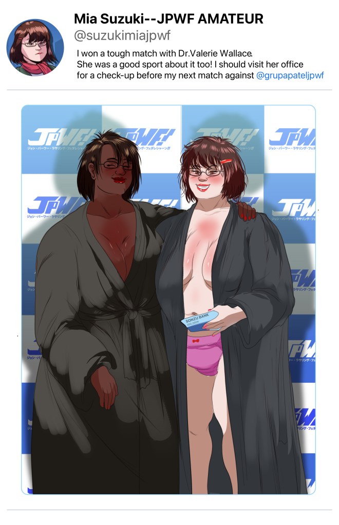 Mia Suzuki has a hard-fought two round match with Dr. Valerie Wallace. One round in the ring, the other in the oil bath. There is some friendly competition in the #JPWF amateur division. And while the winner’s purse is high, there’s no hard feelings towards the loser.